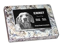 Solid granite Pet Marker with your pet's photo & your words laser etched. A design proof will be emailed to you for approval before the marker is etched. You will have the opportunity to check for errors and make any changes before your pet's marker is made. Once your order is received an email will be sent with the necessary information for you to submit your text and photo. You will be able to choose from our selection of font types and decorative spacers. There is no limit to the number of words you can use for the inscription, but the more words used - the smaller the font. Feel free to include your own ideas & special requests. Send the best photo you have and I will edit it at no charge to produce the best etching possible for your marker. Mailed photos will be returned.