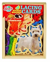 Great Product I got these lacing cards because I wanted to help my son with his fine motor skills. I've tried wooden beads but he never like them; he ended up throwing them away around the house. He adores these cards. He's very much into animals (and the illustrations are super cute), and he seems fascinated with this set. It's also a great challenge for him to make one after another. In addition he plays with them as if they were animal toys. They come in a wooden box for easy storage. I think this is a great and valuable educational toy; the quality is very good and worth the price.